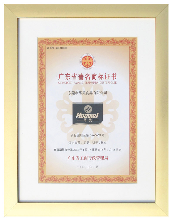 2006年,"华美月饼"--中国名牌; 2013金牌月饼 2013年度中华糕饼领袖品牌20强牌匾证书 2013年广东省著名商标